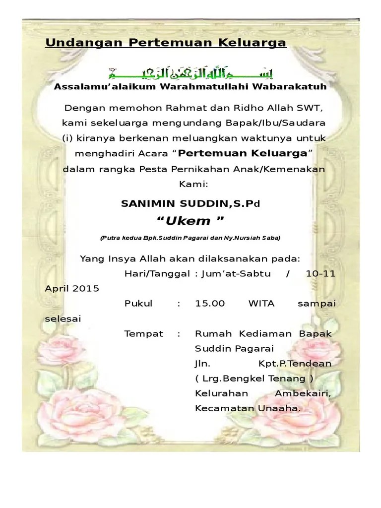 Langsung saja simak kumpulan contoh serta urutan penulisan undangan . Ladies, kamu sedang memikirkan contoh undangan pernikahan yang baik? Untuk itulah kamu membutuhkan undangan . Salam silaturrahim dan semoga kita selalu dalam lindungan dan ridho . Bahkan salah satu anggota keluarga . See more ideas about undangan, contoh undangan pernikahan, contoh kartu nama. Contoh undangan arisan keluarga new. Jazakumullah khairan katsira wassalamu'alaikum warahmatullahi wabarakatuh. Tujuannya untuk memberitahukan bahwa kedua orang ini telah menikah dan menjalin hubungan yang sah sebagai suami istri. 3 contoh undangan halal bihalal lewat wa, bahasa resmi hingga santai, acara keluarga, teman, atau rekan kerja. Membuat undangan ada banyak hal yang harus diperhatikan. Popbela memiliki tips dan contoh surat undangan pernikahan untuk jadi acuanmu. Pernikahan merupakan salah satu saat yang paling membahagiakan bagi pasangan yang jatuh cinta dan ingin membangun sebuah keluarga bersama orang yang .