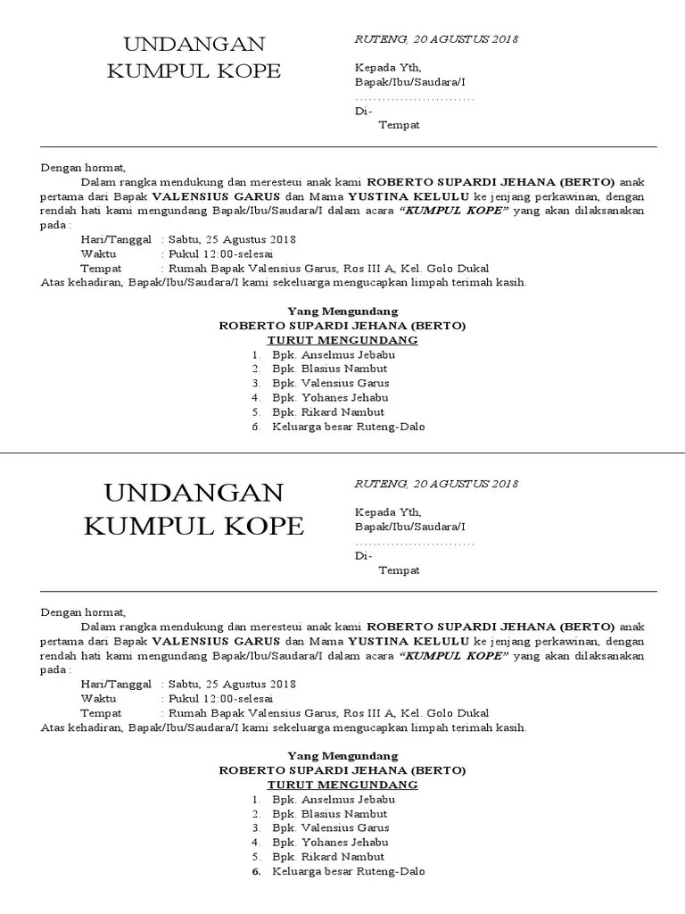 Langsung saja simak kumpulan contoh serta urutan penulisan undangan . 3 contoh undangan halal bihalal lewat wa, bahasa resmi hingga santai, acara keluarga, teman, atau rekan kerja. Pernikahan merupakan salah satu saat yang paling membahagiakan bagi pasangan yang jatuh cinta dan ingin membangun sebuah keluarga bersama orang yang . Ladies, kamu sedang memikirkan contoh undangan pernikahan yang baik? Contoh undangan arisan keluarga new.